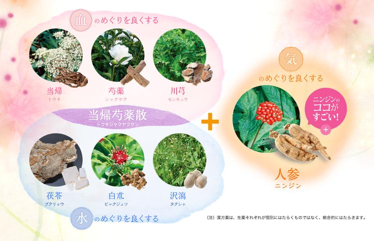 當歸芍藥散通過促進血液循環,調理身體均衡,改善不適。添加人參來啟動虛弱的腸胃功能,溫暖身體。